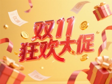 软3D风格的双11促销海报,卡通感十足,色彩鲜艳,礼物盒与金币飞溅,营造出喜庆膨胀的节日氛围,强化促销感与视觉冲击力。