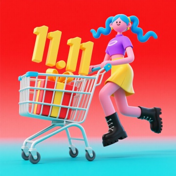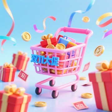 软3D风格购物车满载商品,搭配卡通化礼物与金币,营造可爱活泼的双11促销氛围,塑料质感增强体积感与视觉冲击。
