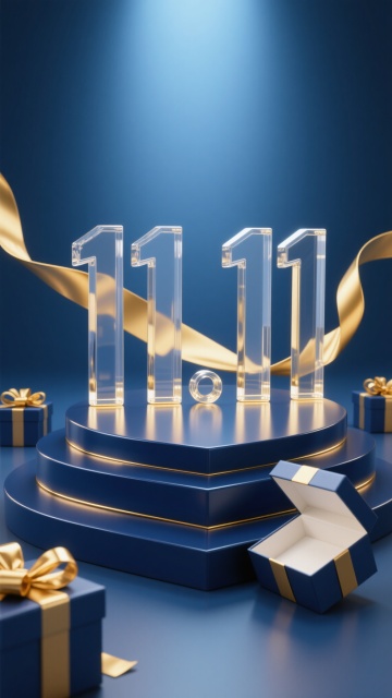 鎏金风与3D微缩艺术结合,金属质感线条勾勒现代奢华,购物车与“11.11”字样呼应双十一大促,科技感光影烘托高端护肤美学。