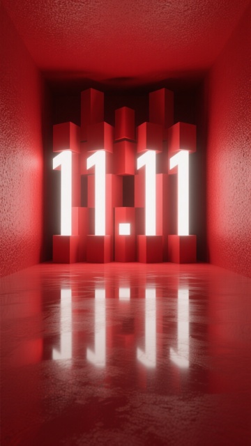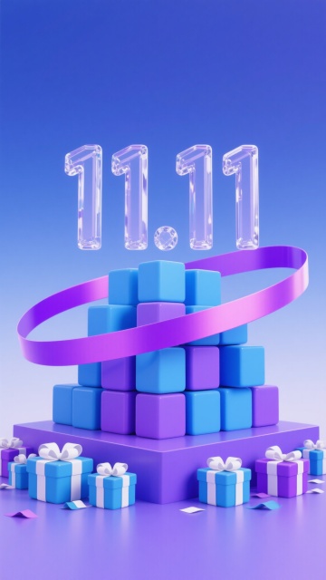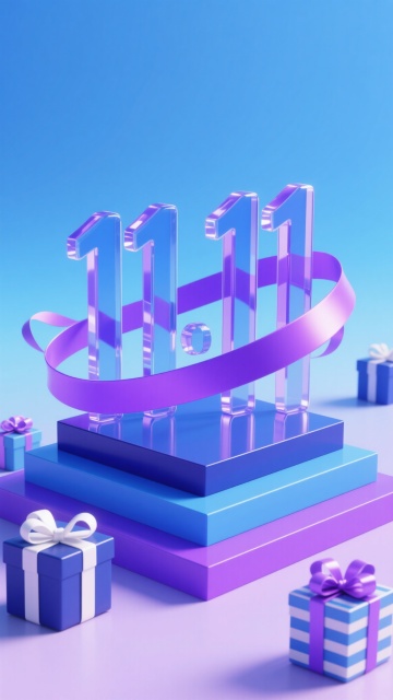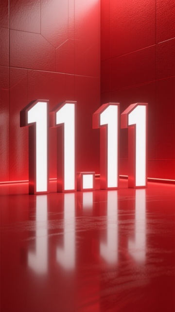 赛博朋克风霓虹灯管打造的3D数字“11.11”,玻璃质感与重拟物设计结合,未来感十足,充满科技与酷炫感,营造双十一促销狂欢氛围。