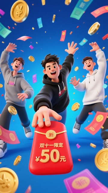 软3D风融合欧洲宫廷艺术,鎏金与金属质感点缀,卡通人物欢庆双十一,喜庆感爆棚,促销信息跃然眼前。