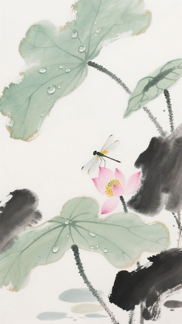 清新水墨工笔风,荷叶露珠晶莹,蜻蜓点水,荷花绽放,尽显夏日雅韵。