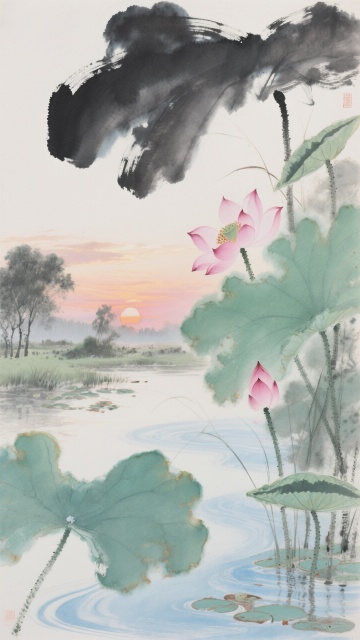 水墨风荷花图,清新古典,水彩渲染,晨曦映衬,意境悠远。