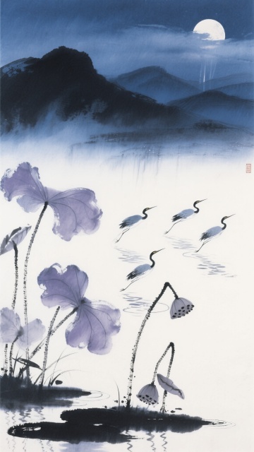 横幅构图,中国水墨画风格,靛青色宣纸上渲染着浓淡不一的墨痕纹理,近景处几株枯荷的枝干以飞白笔法斜斜掠过画面,荷叶以淡墨晕染成半透明的灰紫色,中景是层叠的远山如淡墨剪影般融入暮霭,右上角一轮残月被薄云半遮,月光化作几道淡银灰色的笔触倾泻而下,五只苍鹭呈弧线掠过月下水面,喙尖点破水面形成微小的墨色涟漪,整体色调以靛青、墨黑与月白为主,留白处仿佛笼罩着湿润的夜雾,笔触沉稳而富有呼吸感,营造出清寂深邃的秋夜意境。