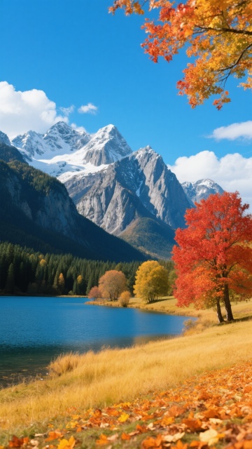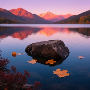 广角俯拍视角,晨曦微露时分,一片被晨雾轻轻笼罩的山谷湖泊全景。远处层叠的青灰色山脉峰顶覆盖着昨夜新降的皑皑白雪,山腰处云海如丝绸般缠绕流动。湖岸线蜿蜒曲折,一侧是橙红与金黄交织的茂密枫林,另一侧是深绿色的松树林,色彩对比鲜明而和谐。湖面如巨大的黑曜石镜面,精准倒映着渐变的天空——从东方鱼肚白过渡到淡粉、浅紫,再到远处的靛蓝。湖边长满沾着露珠的翠绿苔藓,几株红色浆果灌木点缀其间,几片枫叶轻轻漂浮在近岸水面。光线柔和而富有方向性,晨雾在阳光穿透下形成金色光柱,空气中悬浮着细小的水汽颗粒。构图遵循黄金分割,前景的岩石、中景的湖岸与远景的山脉形成完美的视觉引导线,景深从近岸的露珠到远山的积雪都保持清晰锐利,整体氛围既静谧神圣又充满苏醒的生命力。