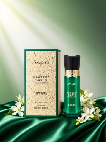 产品放置在绿色有质感的绸布上,瓶身周围环绕茉莉花,搭配绿色布料等物件,背景为浅绿到白色渐变,画面暗色调,主体逆光