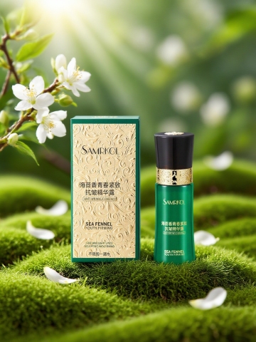鎏金风与玻璃风交融,金属瓶盖折射柔和光影,干花飘浮于琥珀色背景,营造奢华优雅的唯美感,重拟物手法强化质感与实景感。