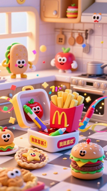 软3D风卡通厨房,拟人化食物萌趣互动,波普色彩碰撞,喜庆氛围拉满,节日感十足。