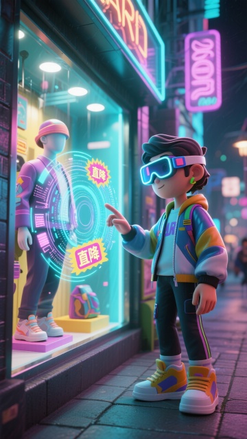 赛博朋克风3D卡通场景,霓虹灯映照未来都市,虚拟现实互动促销,酷炫科技感十足。