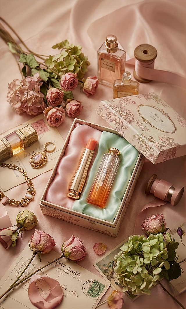 温柔治愈系商业静物摄影风格,画面以柔和渐变的粉红色为背景主色调,搭配深邃酒红与金属银作为视觉点缀,整体色调浪漫且富有层次感。采用平视略俯视的视角,主体错落分布于画面中央的红色信封之上(信封上有粉色火漆印),呈自然直立角度,占据视觉核心区域,主体占画面比例15%。左侧搭配复古银色烛台与点燃的白色蜡烛,后方点缀单支红玫瑰和单只粉玫瑰与散落的玫瑰花瓣,背景为带有细腻肌理的渐变粉色墙面。采用柔和的侧逆光结合均匀补光,营造出细腻的明暗层次与柔和阴影,主体与温馨浪漫的场景融为一体,充满治愈感与氛围感。详情