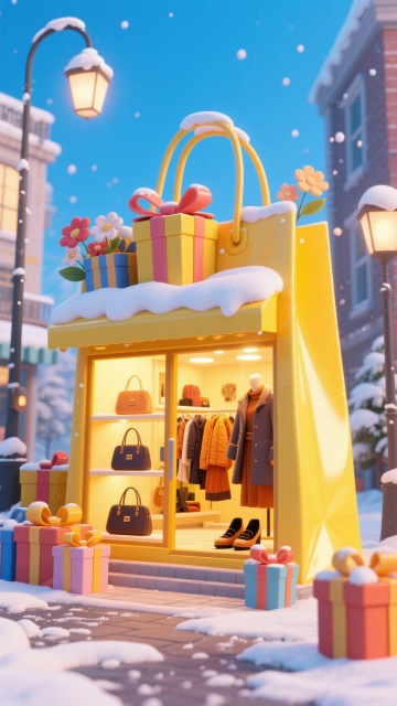 梦幻3D微缩艺术风,黄色购物袋化作店铺,雪夜中绽放温馨喜庆,软塑料质感与彩礼盒交织,萌趣可爱,节日氛围满分。