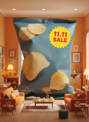 3D超现实风格,巨型薯片袋占据客厅,重拟物塑料质感,明亮色彩强化促销感,11.11大促主题突出。