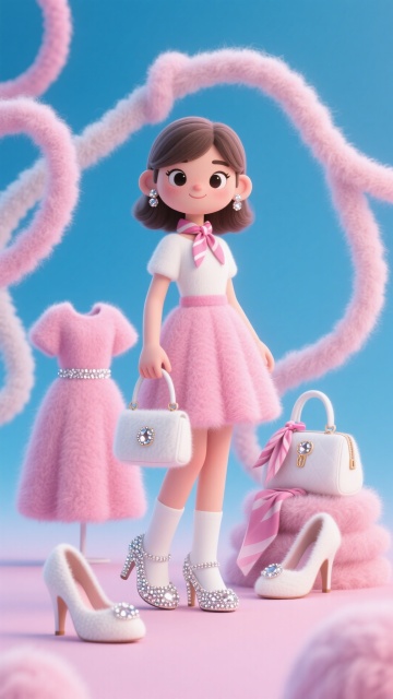 卡通时尚美少女,穿着粉色裙子,白色镶钻高跟鞋,手提时尚包包,脖带丝巾,她身上的所有物品:粉色裙子,白色镶钻高跟鞋,时尚包包,丝巾等物件有层次的摆放展示在旁边。突显个性化与潮流风格。渐变的粉蓝色为背景,营造出充满活力与现代感的视觉氛围。构图层次分明,色彩对比柔和,传达出时尚洋气淑女的穿搭风格。