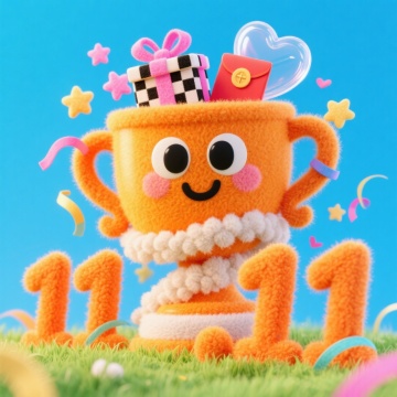 毛茸茸的黄色购物袋拟人化,推着满载礼物的购物车,3D卡通风格萌趣十足,传递双11节日购物的欢乐氛围。