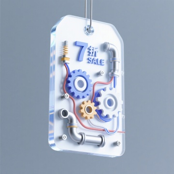 透明玻璃风3D票券,融合齿轮与管道的轻拟物设计,科技感十足,展现未来感清透美学,传递50%折扣优惠信息。