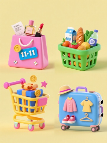 软3D风格,拟人化购物元素,色彩明亮,趣味十足,融合可爱与促销感,营造双十一狂欢氛围。