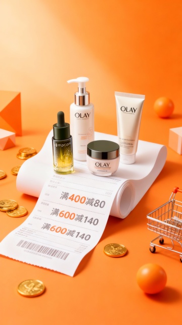 以橙色渐变背景为基调,中央是一张卷起的白色购物小票作为主要承载物,上面摆放 OLAY 品牌的三瓶护肤品(分别是按压泵式精华、瓶装乳液、管状面霜),小票上有 “满 400 减 80”“满 600 减 140” 等促销信息,周围散落金色硬币、橙色球体、迷你购物车和几何图形装饰,整体呈现电商促销的热闹氛围。光影效果:采用明亮柔和的光线,突出产品的质感和立体感,背景有轻微的虚化处理,聚焦主体。风格特点:现