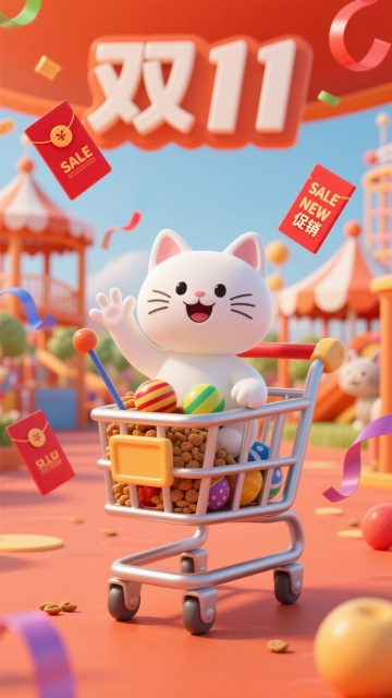 3D风拟人猫咪推车购物,霓虹灯与粒子光效营造梦幻科技感,卡通风格融合促销元素,展现双十一宠物狂欢节的未来感与可爱氛围。