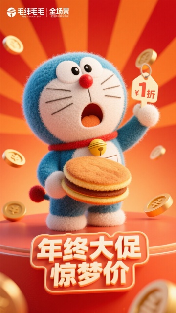 软3D毛绒质感哆啦A梦手持饼干,搭配金币与1折标签,喜庆红橙背景,萌趣卡通风格传递年终促销惊喜。