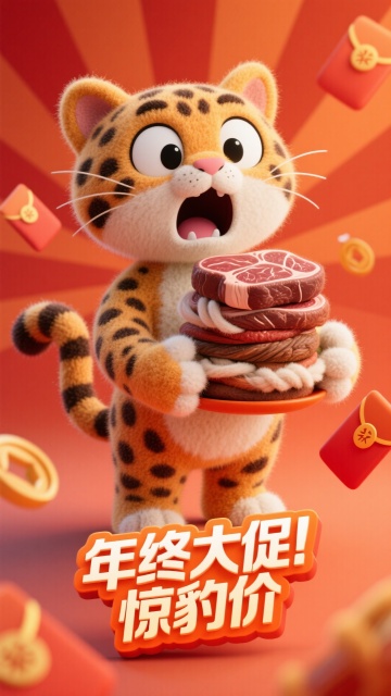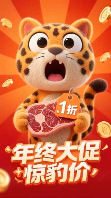 一只卡通豹子惊讶表情,拿着一个带价格标签“1折”的牛排,促销感橙红背景,放射线、金币元素点缀,画面下方3D文字标签“年终大促 惊豹价”。
