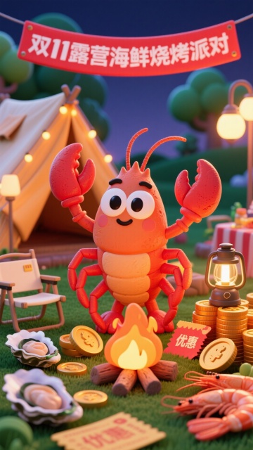 软3D风格的拟人化龙虾在露营场景中欢庆双11,搭配卡通感十足的海鲜烧烤派对元素,营造出温馨喜庆、趣味十足的促销氛围。