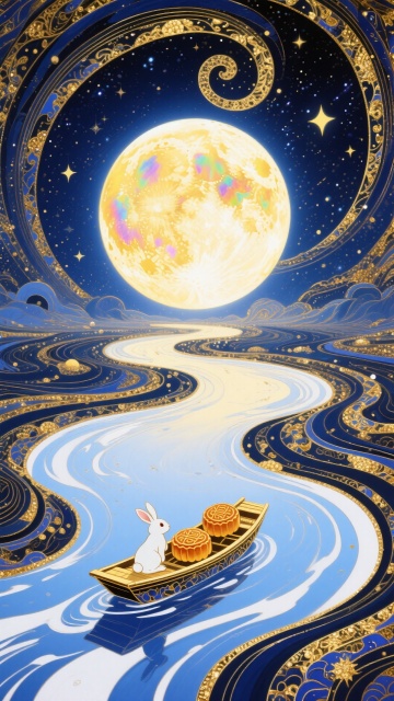 梦幻夜空下,玉兔泛舟于鎏金漩涡之海,月华如练,中式国潮插画风融合液态浮雕质感,营造奢华唯美中秋意境。