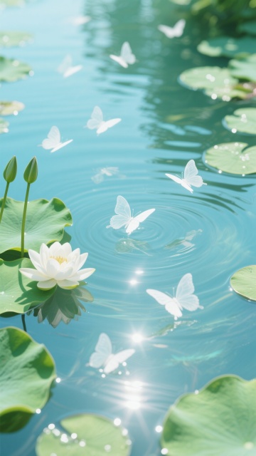夏日氛围的水面背景,整体色调调整为清新明亮的蓝绿色系,水面上漂浮着翠绿的荷叶和白色的荷花花苞,水面纹理呈现出细腻的波纹和柔和的光斑效果,许多半透明的白色蝴蝶在水面上方轻盈飞舞,画面整体营造出轻盈、梦幻、通透的感觉,光线明亮柔和,带有自然的光晕效果,色彩和谐统一,充满夏日的生机与清凉感。