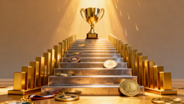 一张简约现代风格的素材图,纯色背景,中央位置规整排布着一个金色奖杯图案。奖杯具有光滑的金属质感,顶部为五角星造型,下方连接着优雅弯曲的金色支架,底座为深棕色六边形,整体光影过渡自然,高光和阴影细节清晰,设计简洁而富有立体感。