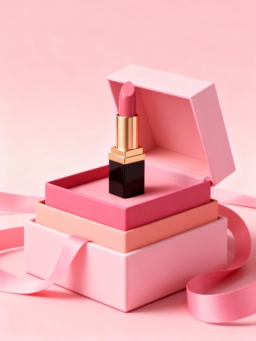 3D重拟物风格,柔和粉调营造甜美舒适感,金属质感唇膏与塑料风礼盒交织,节日氛围浪漫精致。