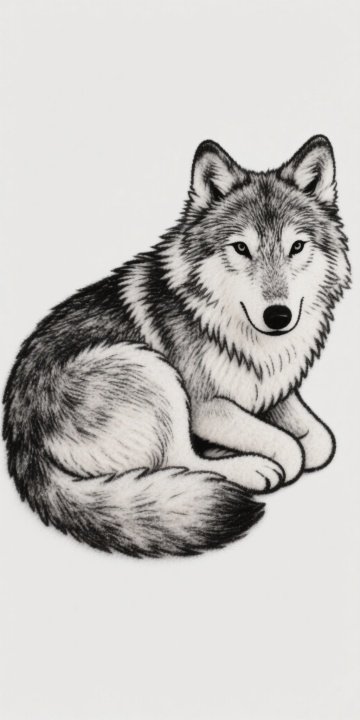 一幅黑白线条画,描绘了一只蜷缩着的狼,它的毛发细节丰富,姿态显得安静而警觉,背景为纯白色,突出主体的线条艺术风格。