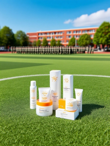 清新简约的防晒产品陈列于绿茵场上,背景实景感强,阳光明媚,尽显夏日活力。