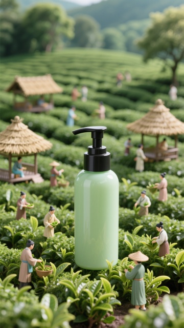 清新水彩风插画,微缩中式茶园景象,展现自然与人文的和谐美。