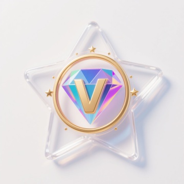 3D渲染的会员主题图标,白色背景,透明质感的星形外框,内部为多色渐变的钻石形状,钻石中心有金色立体"V"字,环绕着金色圆环和小星星装饰,整体呈现出光滑的金属光泽和细腻的光影效果,具有现代感和奢华感。