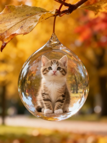 秋日落叶间,晶莹水滴中悬浮着一只萌猫,梦幻与清透交织,微缩艺术与玻璃质感交融,唯美超现实。