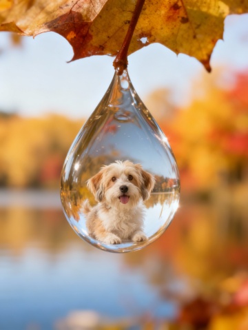 秋天,枫叶悬垂的水滴中,萌犬静坐,玻璃风微缩艺术,梦幻清透,唯美超现实。