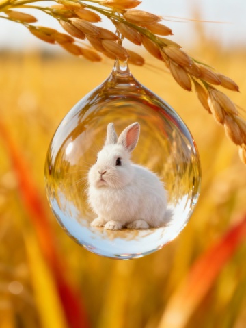 梦幻感与唯美交织,微缩艺术风呈现玻璃滴中萌兔,清透晶莹,超现实主义构图,秋天麦田背景,可爱感十足。
