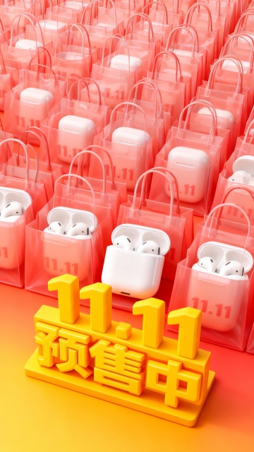 大量浅橙色半透明购物袋整齐排列,每个购物袋内都放着重复相同的图中主体,每个袋子上印有醒目的 “11.11”,俯视,背景为橙色,热闹的促销氛围,下方为黄色3D大字立牌“11.11 预售中”。