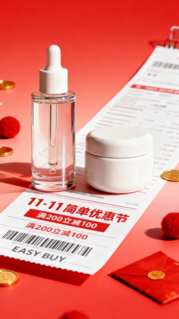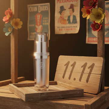 鎏金风与3D微缩艺术结合,金属质感线条勾勒现代奢华,购物车与“11.11”字样呼应双十一大促,科技感光影烘托高端护肤美学。