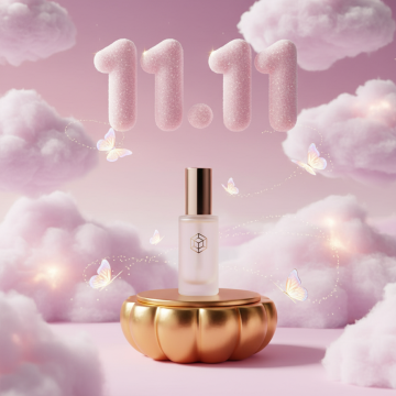 梦幻粉紫云境中,鎏金底座托举晶莹瓶身,软3D风格融合粒子光效与翩跹蝴蝶,营造唯美甜蜜的虚拟自然氛围,呼应双11节日奢美主题。