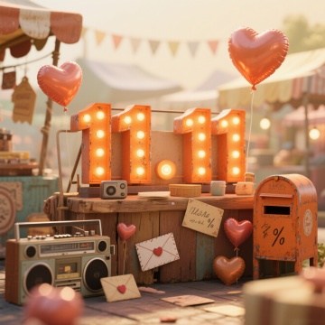 复古木雕风3D场景,拼贴式市集布景,质朴藤篮满载节庆好物,喜庆彩旗飘扬,城堡背景烘托双十一节日氛围。