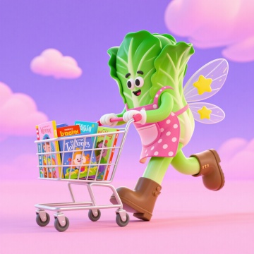 梦幻粉紫天空下,拟人化卷心菜精灵推着购物车奔跑,软3D卡通风格,萌趣可爱,童书满载,塑料质感细腻,双11节日氛围童真浪漫。