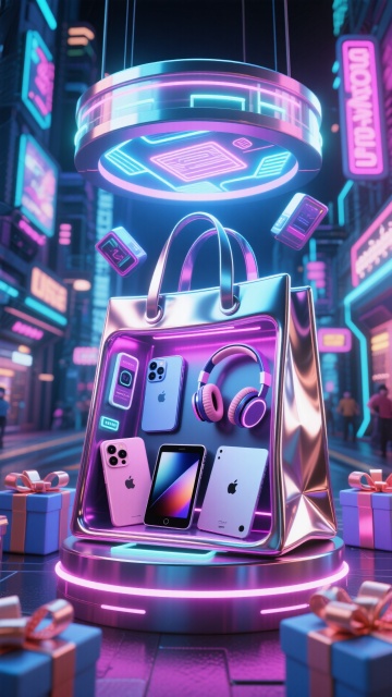 赛博朋克风3D城市夜景,霓虹灯辉映“11.11”悬浮字样,购物车满载手机飞驰于高楼间,粒子光效与虚拟现实元素交织,酷炫未来感十足。