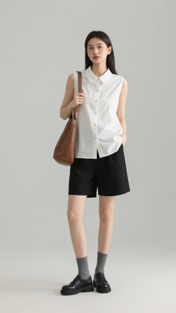 一位女性模特穿搭展示,身着白色短袖翻领衬衫,衬衫有胸前口袋和纽扣设计,搭配黑色中长款A字半身裙,脚穿米色运动鞋和白色中筒袜,右手自然下垂拿着一个棕色布面包袋,左手插在裙兜里,整体姿态自然放松。画面采用简约写实风格,背景为浅灰色纯色,光线柔和均匀,呈现出舒适、日常的穿搭氛围,色彩以黑白棕为主色调,和谐统一,突出服装的剪裁和质感。