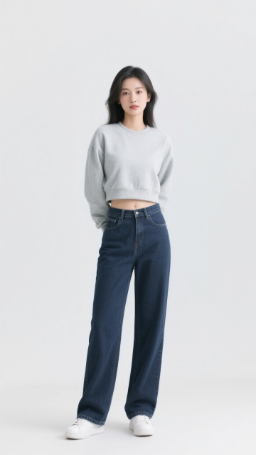 一位年轻亚洲女性的全身人像,人物正面站立,双手背在身后,姿态自然,表情平静。采用高清商业摄影风格,柔和均匀的正面光源,白色纯色背景,画面干净简洁,主体突出。人物展示完整,包括发型、面部表情、身形姿态。穿搭改为简约时尚风格:上身是一件浅灰色的宽松短款卫衣,搭配一条高腰深蓝色直筒牛仔裤,脚穿白色运动鞋,整体休闲舒适,符合日常穿搭展示需求。