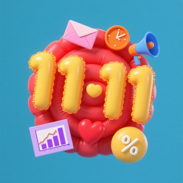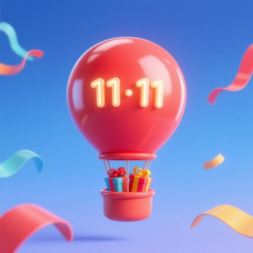复古风市集摊位,霓虹灯数字“11.11”点亮喜庆氛围,木质纹理与金属收音机交织温馨浪漫,心形气球与信封点缀甜蜜趣味,3D重拟物风格营造双十一节日梦幻感。