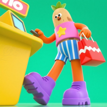 软3D风格的拟人胡萝卜骑自行车,戴着牛仔帽,手提购物袋,充满卡通趣味与可爱感,色彩明亮,双11节日氛围浓厚。