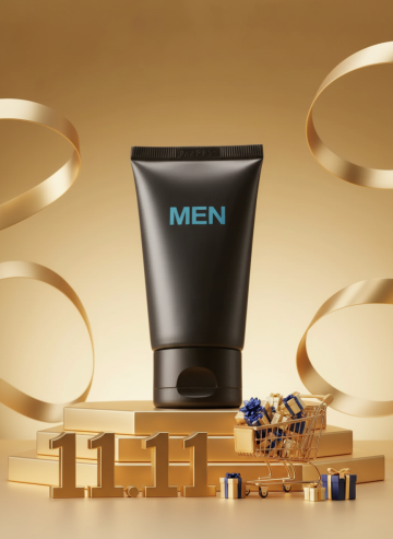 鎏金风与3D微缩艺术结合,金属质感线条勾勒现代奢华,购物车与“11.11”字样呼应双十一大促,科技感光影烘托高端护肤美学。