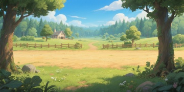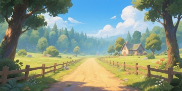 插画风的虚拟自然景观,清新舒适,小屋与绿树相映,营造出宁静的田园氛围。