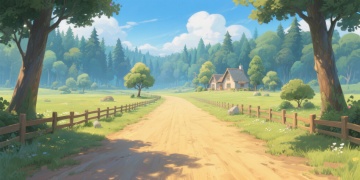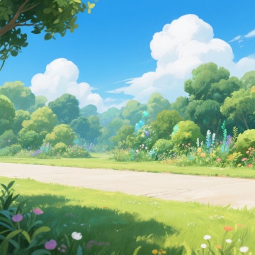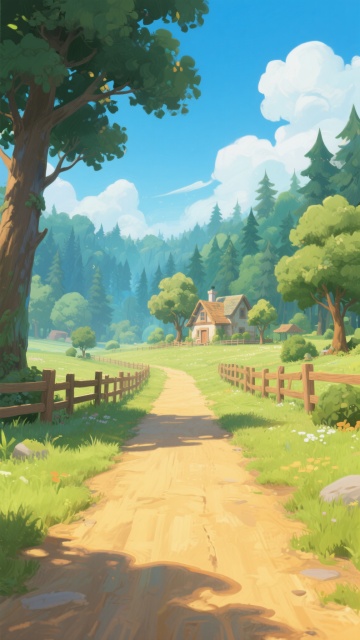 插画风虚拟自然景观,清新舒适,蓝天白云下绿树成荫,营造梦幻田园氛围。
