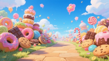 梦幻甜品世界,插画风软3D设计,超现实主义糖果森林,甜美可爱。